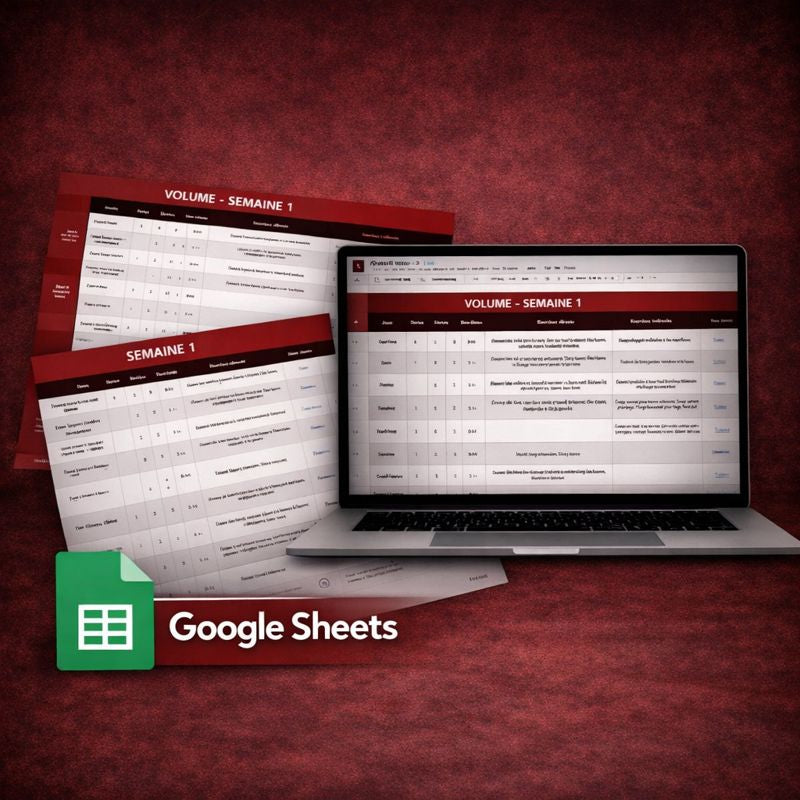 - 1 Google Sheet contenant le programme avec les exercices, les séries, les répétitions, l’intensité, les temps de repos, les conseils techniques, les vidéos d’exécution et des variantes d’exercices.